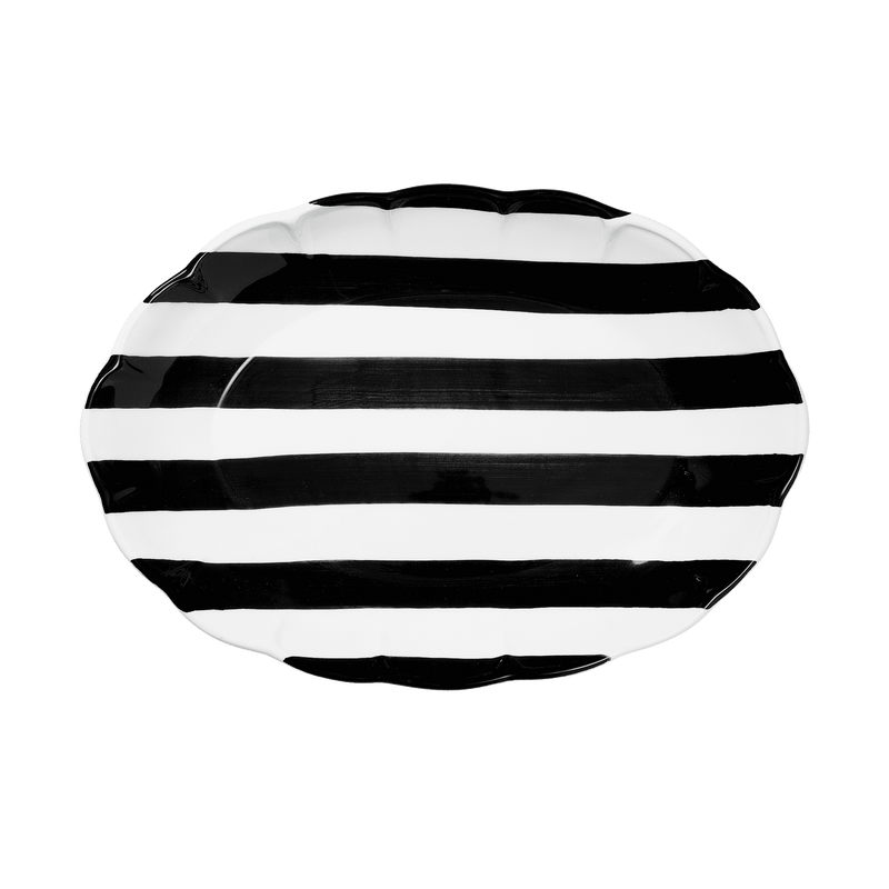 Denna produkt är en del av vår Stripe-kollektion. Handgjord och handmålad i Portugal av våra skickliga hantverkare, är detta serveringsfat i lergods perfekt att kombinera med våra Swirl-middagstallrikar eller använda på egen hand för att presentera dina rätter på ett elegant sätt.