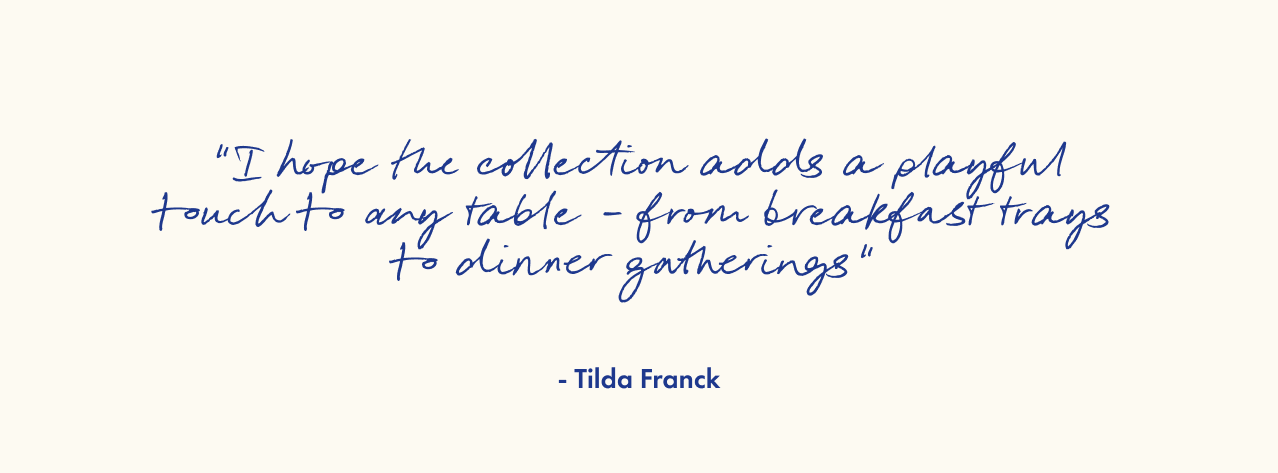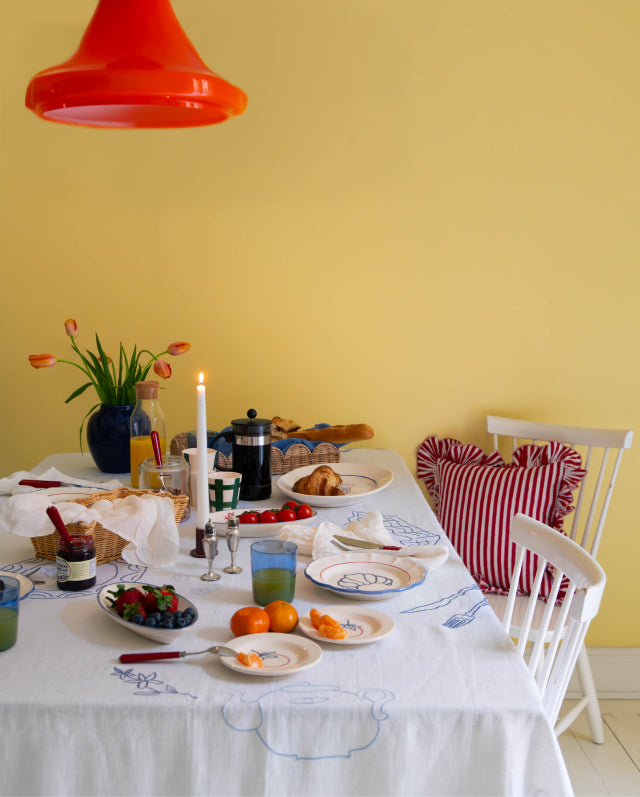 Our new Picnic collection marks a special collaboration with Swedish illustrator Tilda Franck. Featuring hand-painted ceramics and embroidered napkins, the series blends Tilda’s playful botanical motifs with our signature craftsmanship. Designed to mix effortlessly with existing pieces, it brings a fresh, whimsical touch to summer tablescapes.