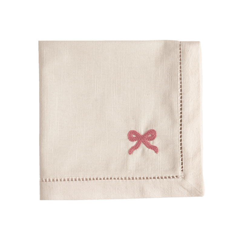 Whether you're hosting a formal dinner party or enjoying a casual meal in the garden, our flirty yet sophisticated Bow Napkin adds a touch of playful elegance to any occasion. This crisp white cotton napkin is handmade from 100% cotton, delicately embroidered by hand with our iconic POPPY bow symbol.