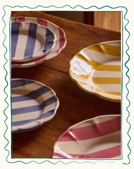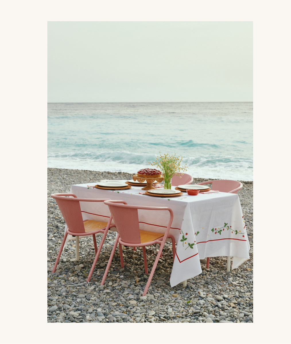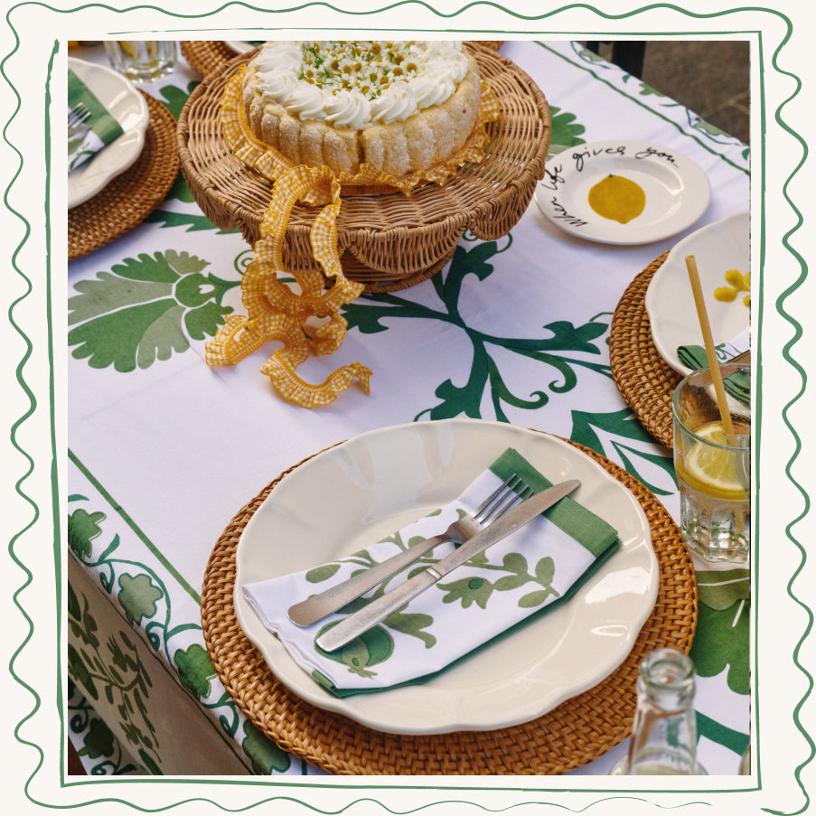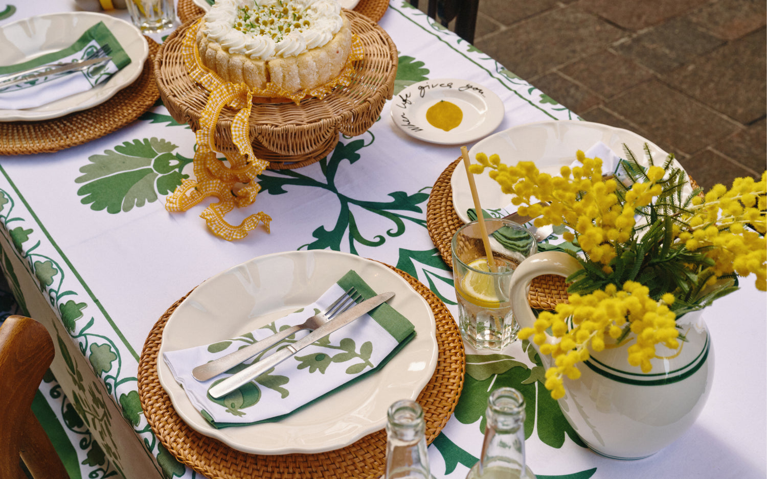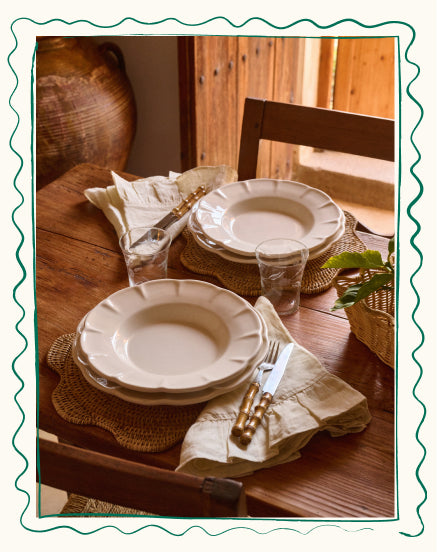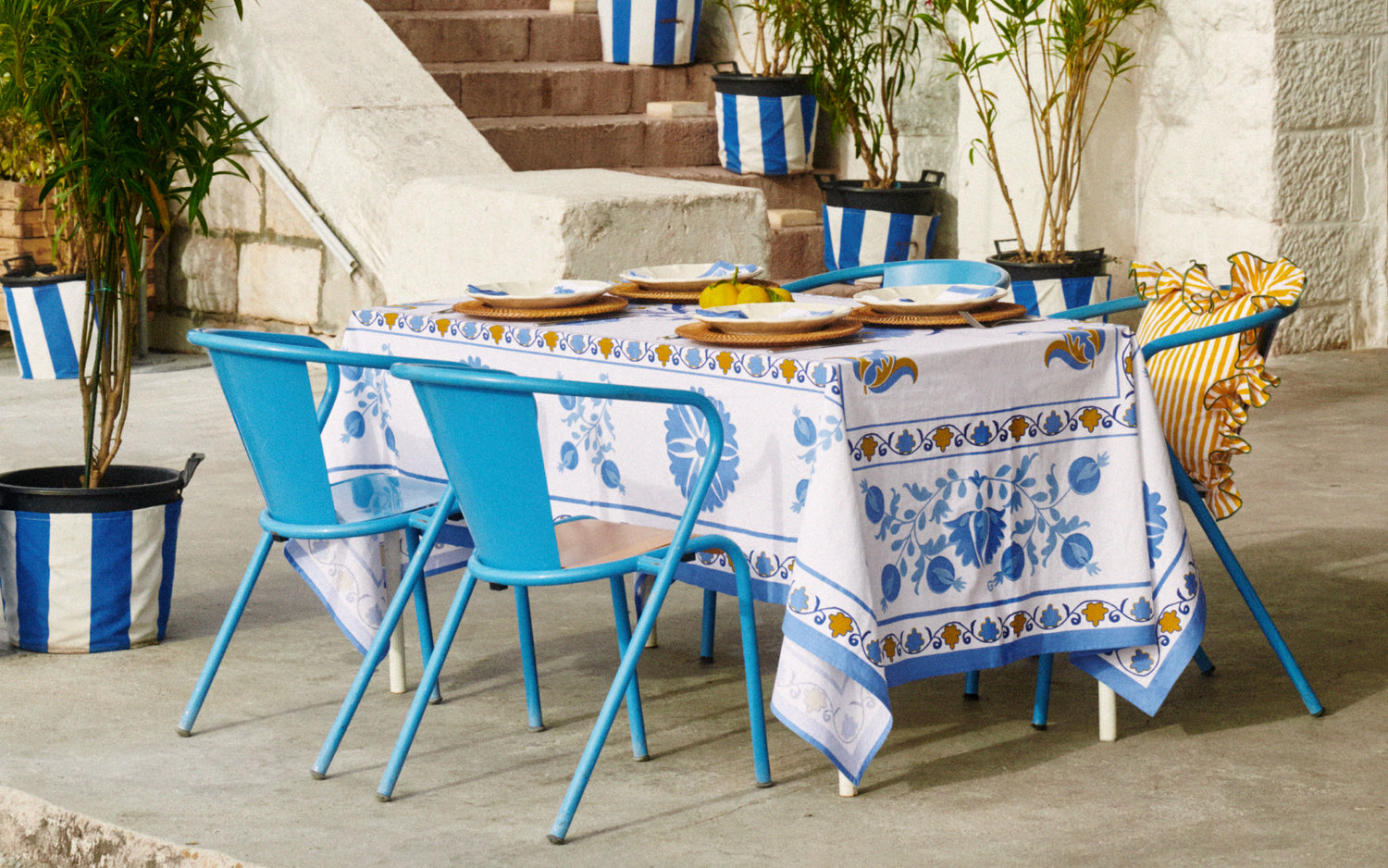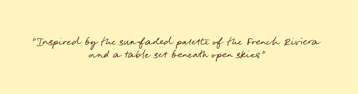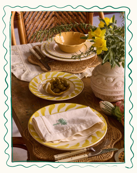The collection is a tribute to the light of the Southern European summer, where every plate and textile feels like a carefully chosen treasure. Shades of clear blue, vibrant mimosa yellow and olive green are set against a base of crisp white and the natural texture of rattan.