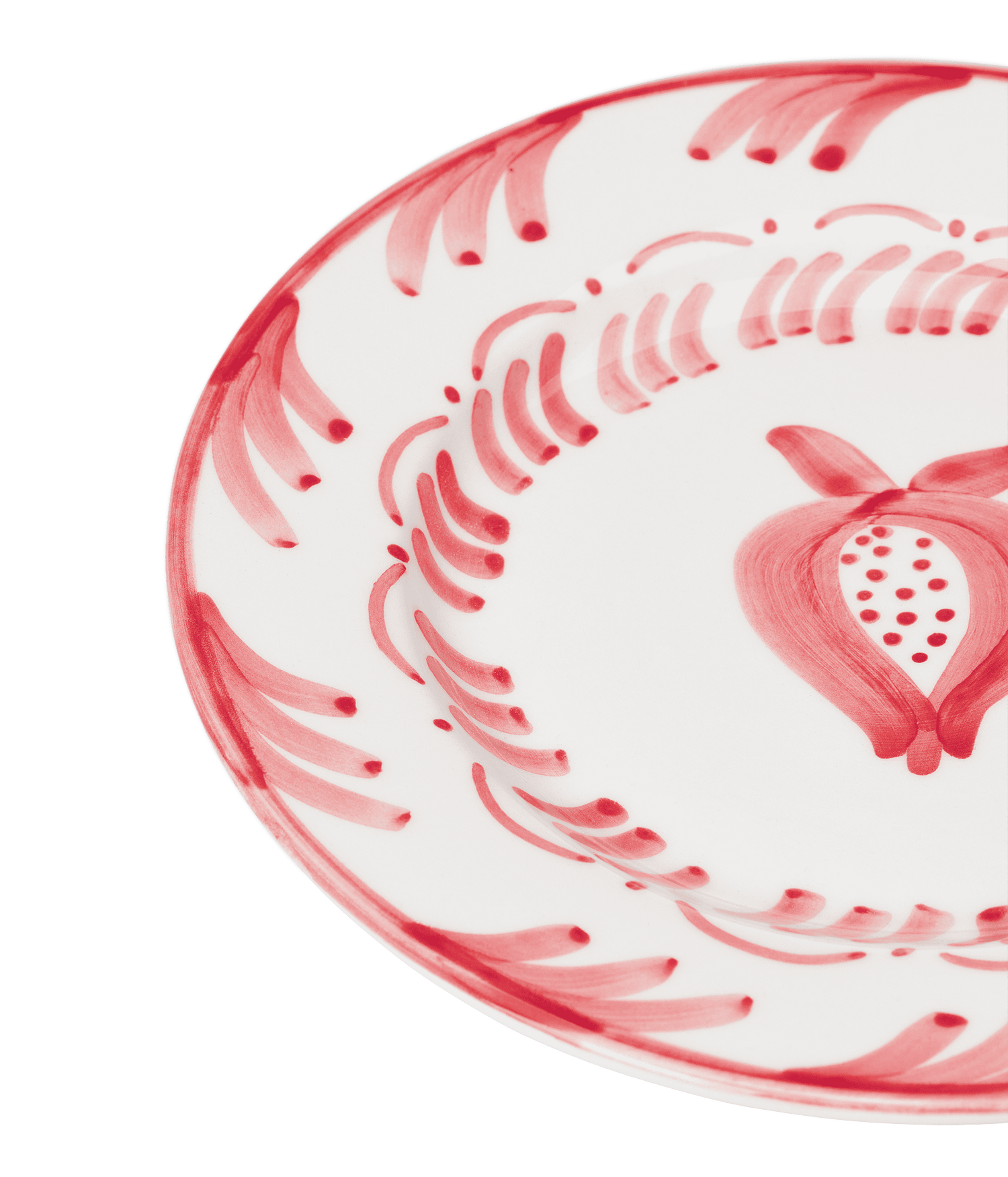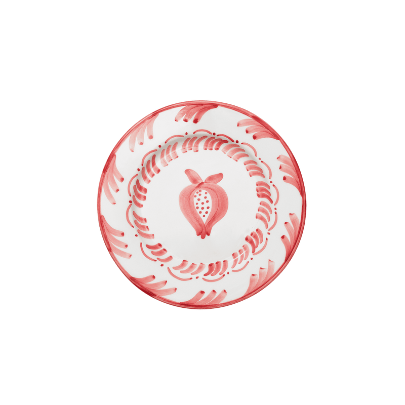 Our Pomegranate salad plate is handmade in earthenware using traditional craftsmanship from Portugal. Adorned with a hand-painted pomegranate motif and a decorative border, this plate symbolizes abundance and the beauty of harvest. Perfect for creating a warm, inviting atmosphere, it adds both charm and elegance to your table setting.