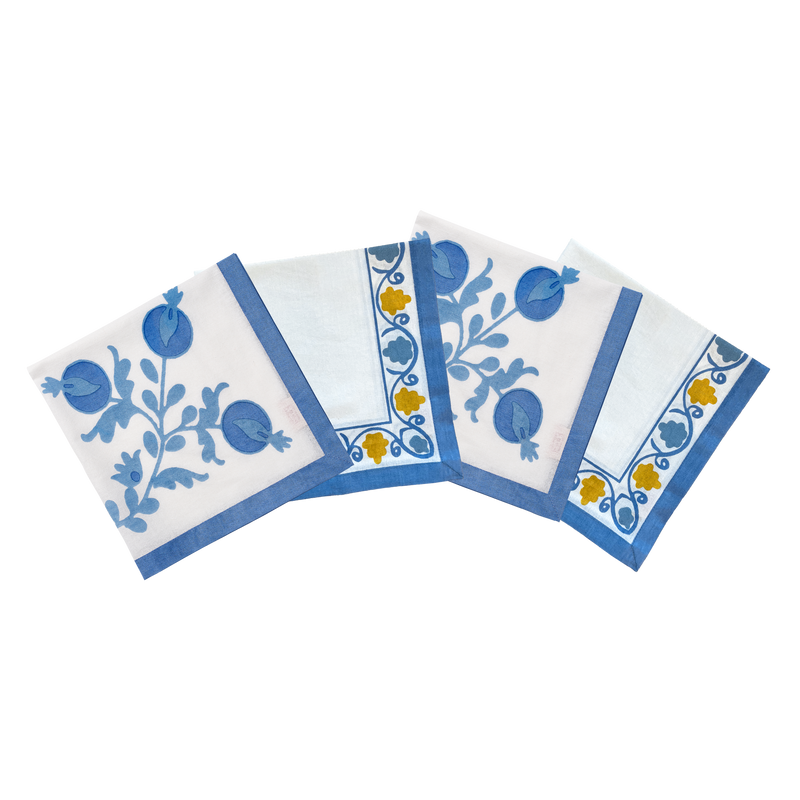 Our Suzani napkins add color and craftsmanship to your table setting. Inspired by traditional folk patterns and hand-printed in Jaipur. With a blend of Nordic nostalgia and Indian artistry, these napkins create a unique setting suited for both everyday meals and festive occasions. Sold in sets of four, with two variations of the pattern in each pack, they’re perfect for adding a charming and colorful touch to your table.