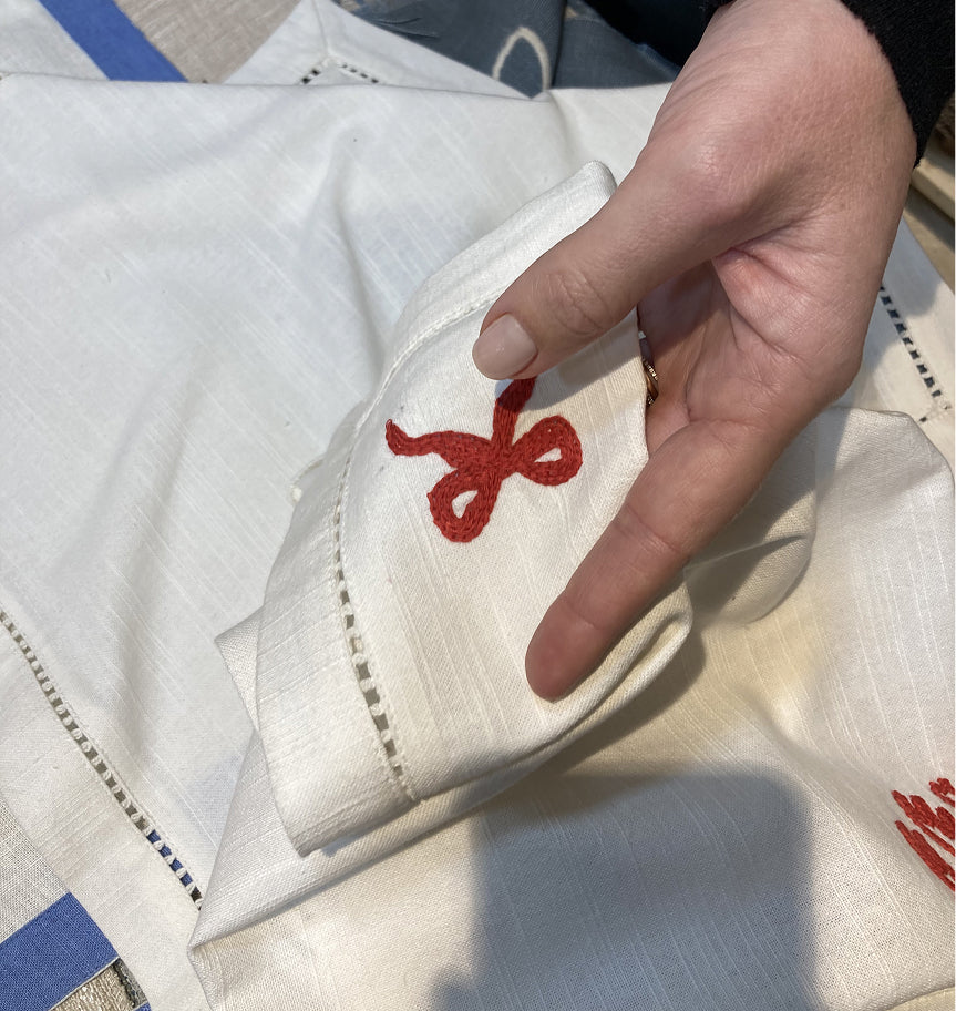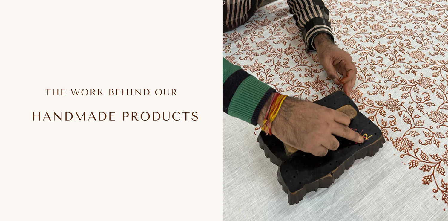 All our textiles are made by hand in India, with traditional Indian methods. Our tablecloths, cushion covers and napkins are block-printed by hand, as well as our napkins with embroidery that are carefully created by hand. This adds a personal touch and artistry to each piece, making every tablesetting unique!