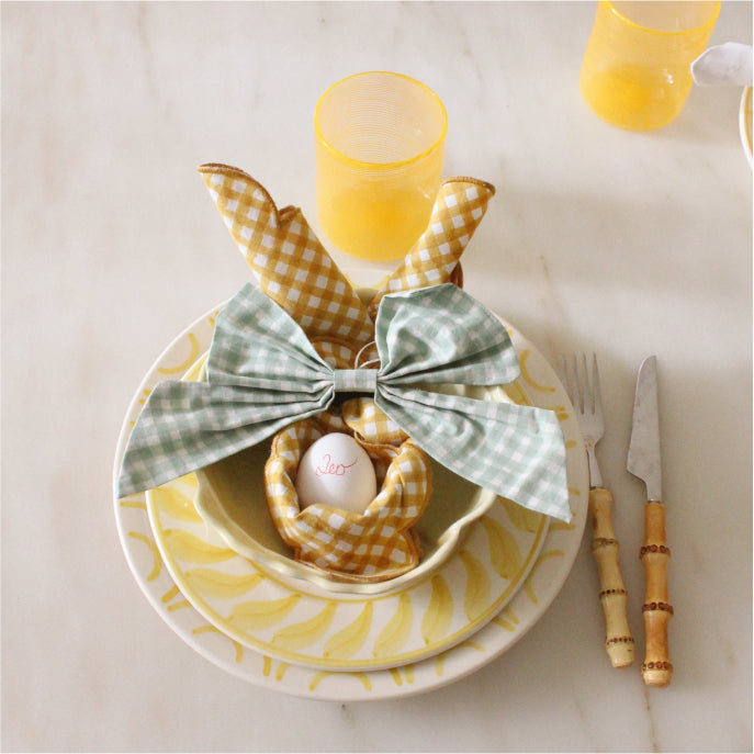 Add a fun detail to your setting with personalized placement cards made from napkins, decorative bow napkin rings, and boiled eggs—a simple yet thoughtful detail that makes every guest feel welcome.