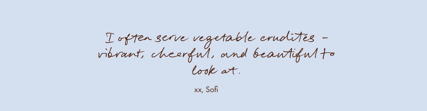 There’s something special about a colorful crudité platter with a simple lemon dip – fresh, beautiful, and always the first to disappear. Perfect to serve on hand-painted ceramics that let the colors shine.