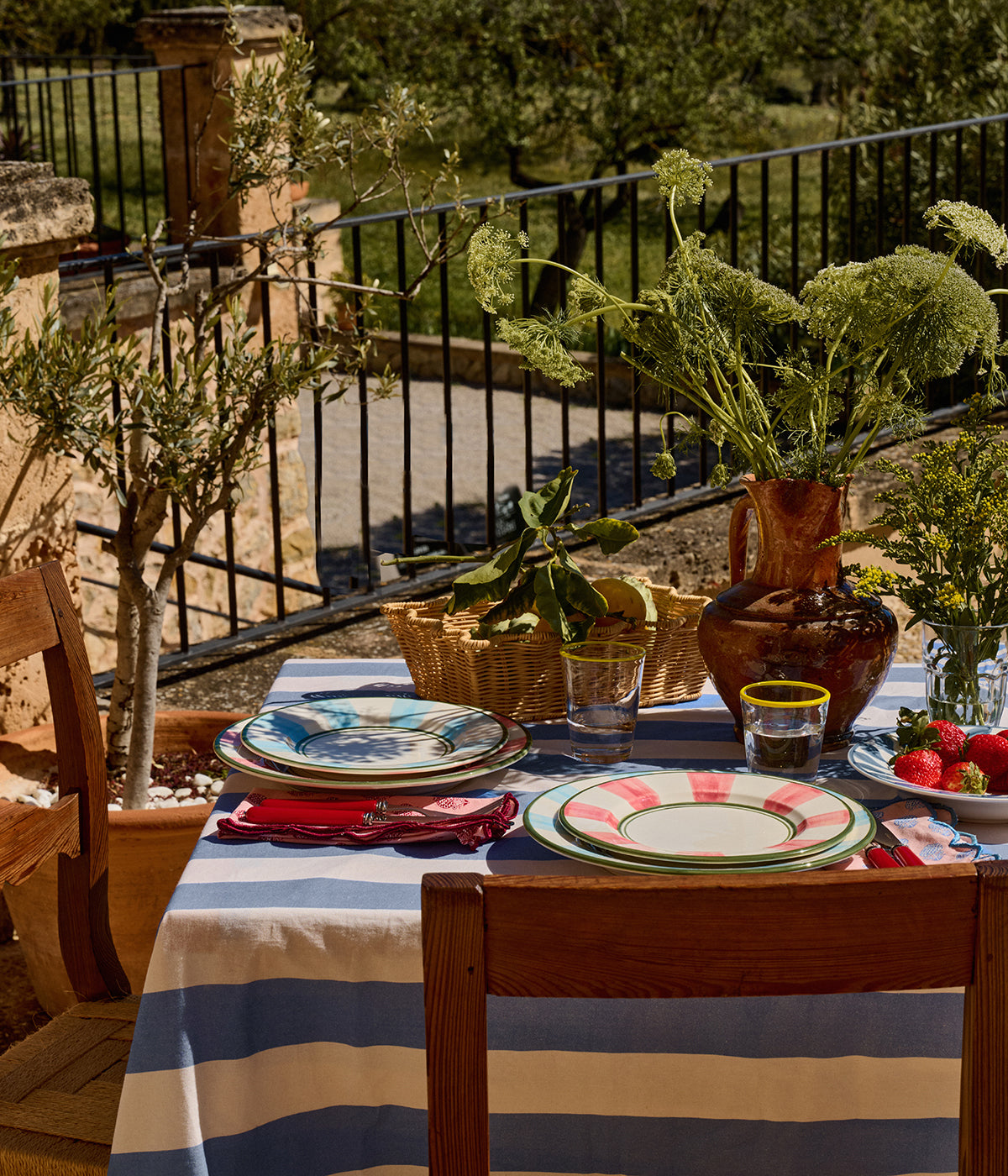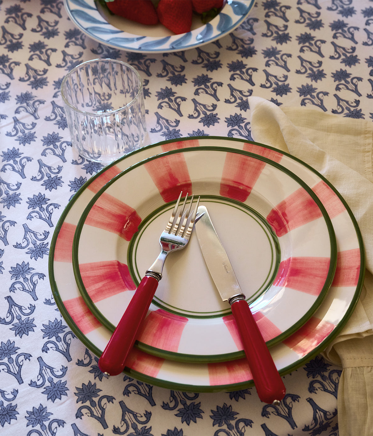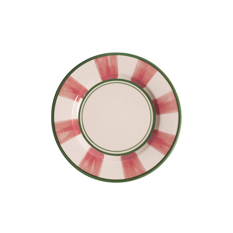 This product is part of our Circus Collection. Handmade in Portugal and adorned with lively hand-painted stripes in in warm pink with contrasts of green, the Circus Salad Plate pairs perfectly with our larger Circus Dinner Plate or when you simply want to enjoy a playful snack.