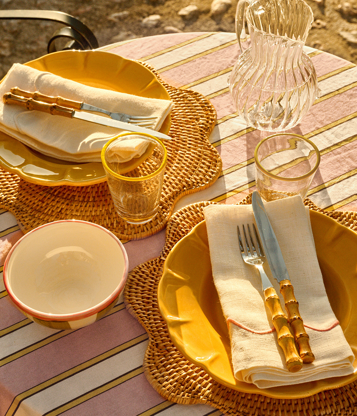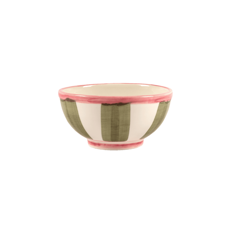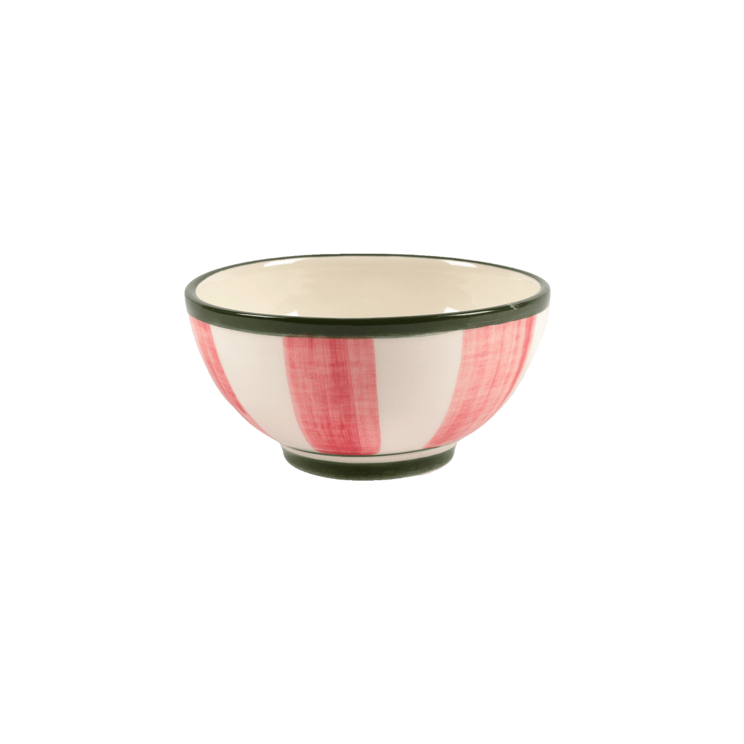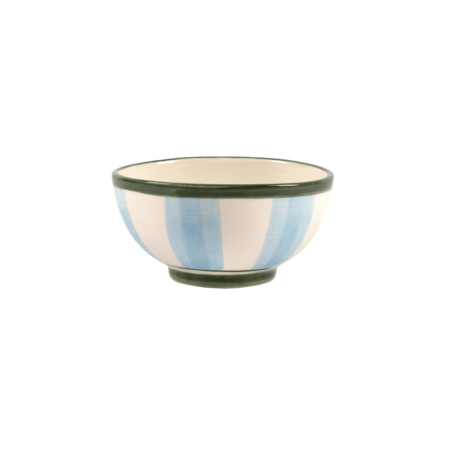 Looking to add another dimension to your table setting or simply enjoy a snack in the sun on a hot summer day? Our Circus Small Bowl, part of the Circus Collection, is available in lively stripes of blue, green, and pink. Handmade and hand-painted in Portugal, this ceramic bowl adds playfulness to any dining occasion.