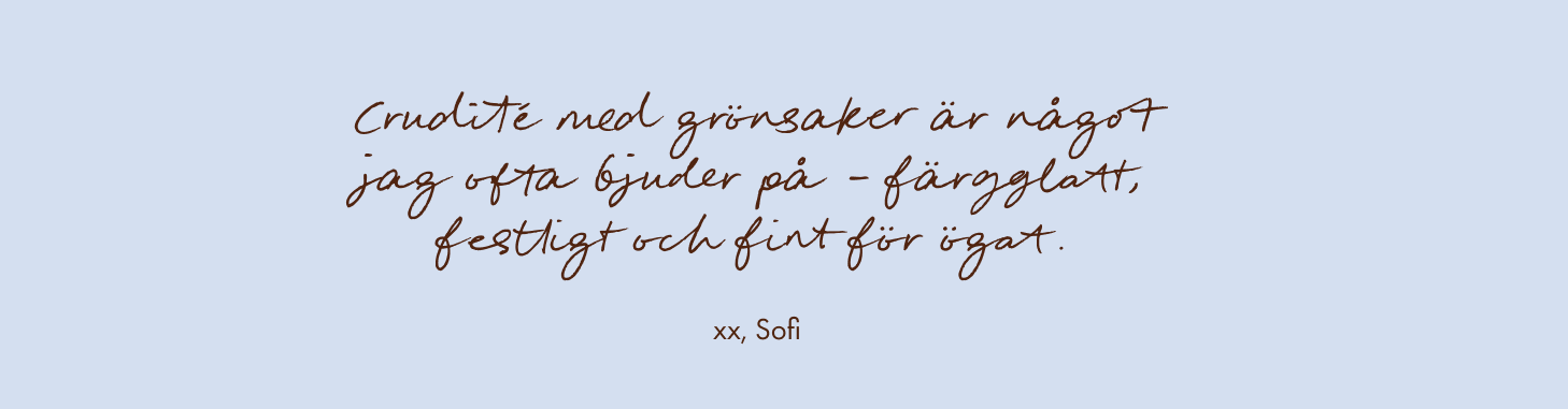 Det är något speciellt med att låta färska grönsaker bli en del av dukningen. Denna Crudité med citrondipp är både ett friskt tilltugg, vacker för ögat och alltid det första som tar slut.