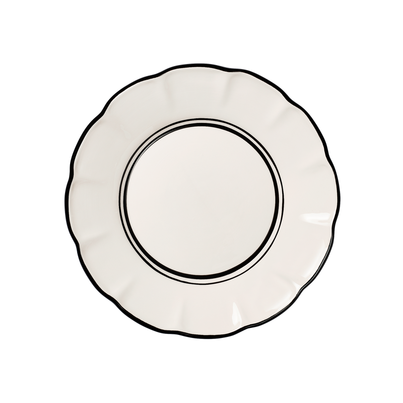 Denna tallrik är en del av vår kollektion Bistro. Tallriken är handgjord och handmålad av konsthantverkare i Portugal och adderar en avskalad men tidlös känsla till varje dukning. Den klassiska vita designen får liv genom färgade konstraster och sin vackert inramande kant.