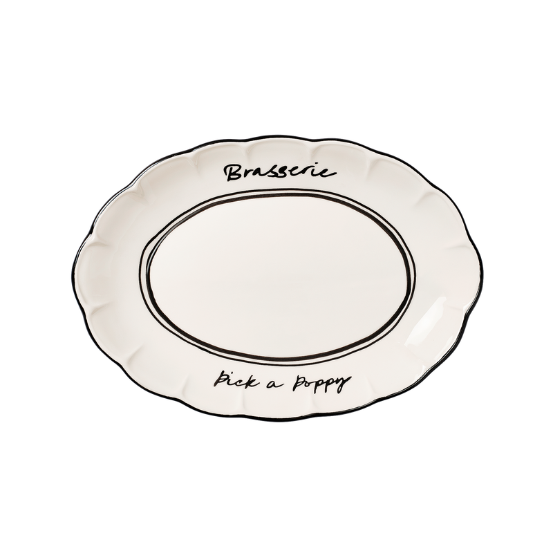 Detta serveringsfat är en del av vår kollektion Bistro. Fatet är handgjort och handmålat av konsthantverkare i Portugal och adderar en avskalad men tidlös känsla till varje dukning. Den klassiska vita designen får liv genom färgade detaljer och sin vackert inramande kant.